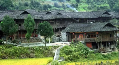典型的土家民居吊脚楼,它在烟雨缥缈中,错落有致,高低起伏透着厚重朴实的气息。